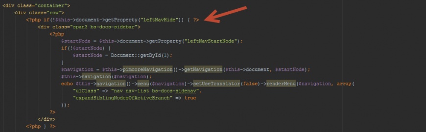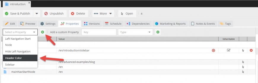 On this page we use "Properties" to hide the navigation on the left and to change the color of the header to blue.